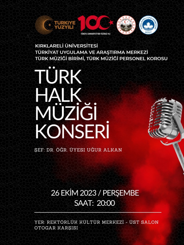 Cumhuriyetimizin 100. yılı kutlamaları kapsamında Üniversitemiz Türkiyat Uygulama ve Araştırma Merkezi Türk Müziği Birimi, Türk Müziği Personel Korosu tarafından 26 Ekim 2023 Perşembe günü, saat: 20.00'da Rektörlük Kültür Merkezi Üst Salonda "Türk Halk Müziği Konseri" düzenlenecektir. Konsere tüm öğrenci, personel ve vatandaşlarımız davetlidir.